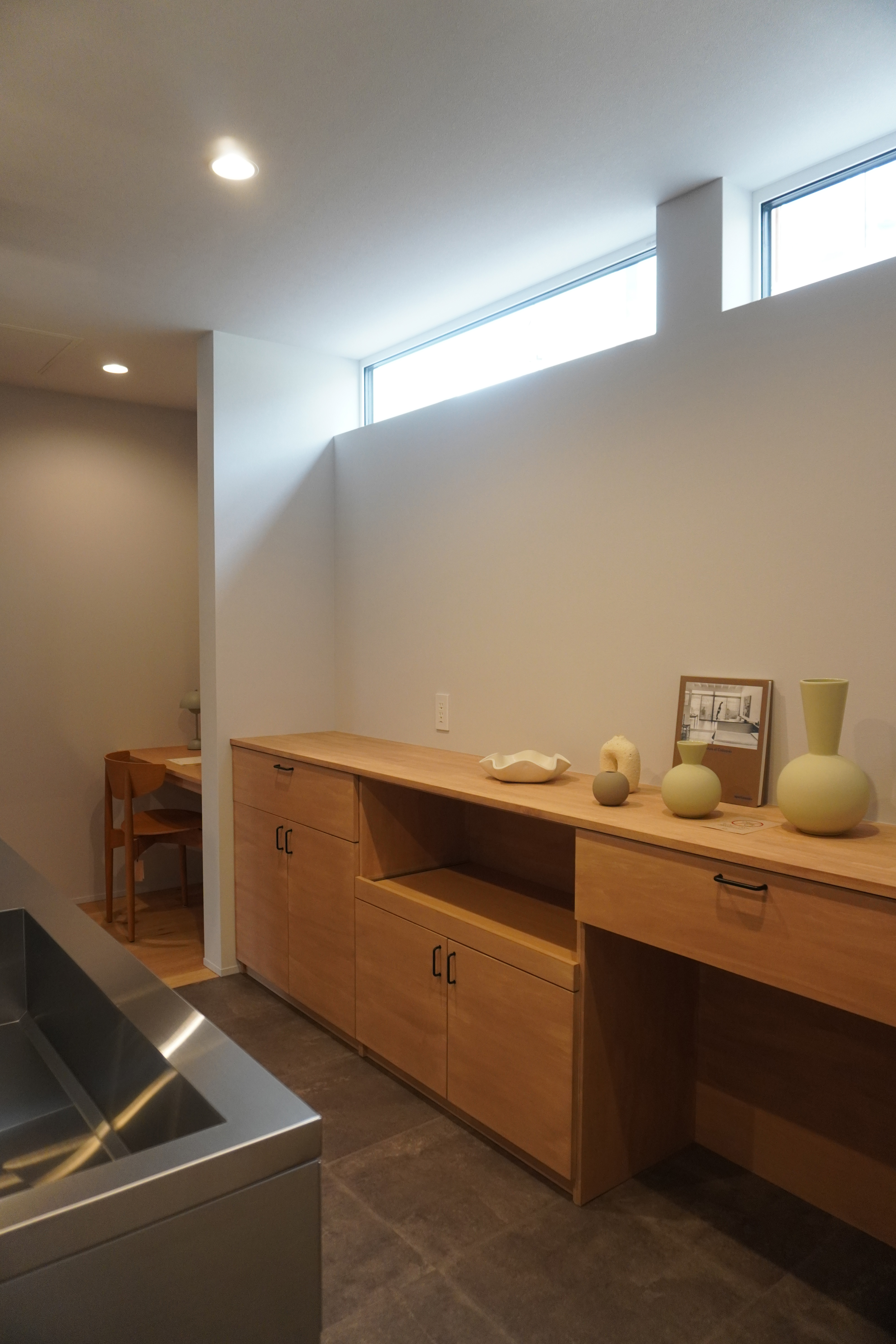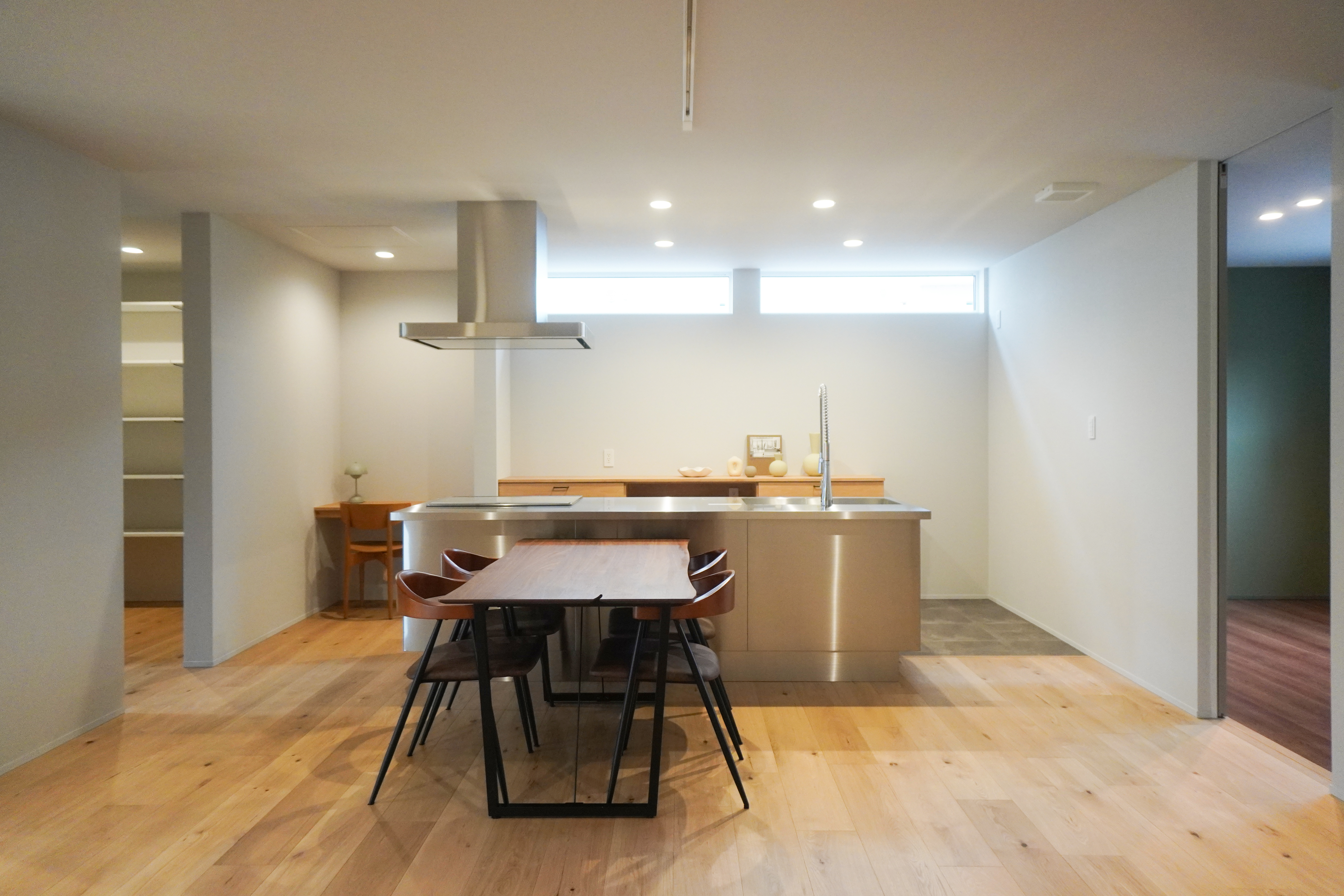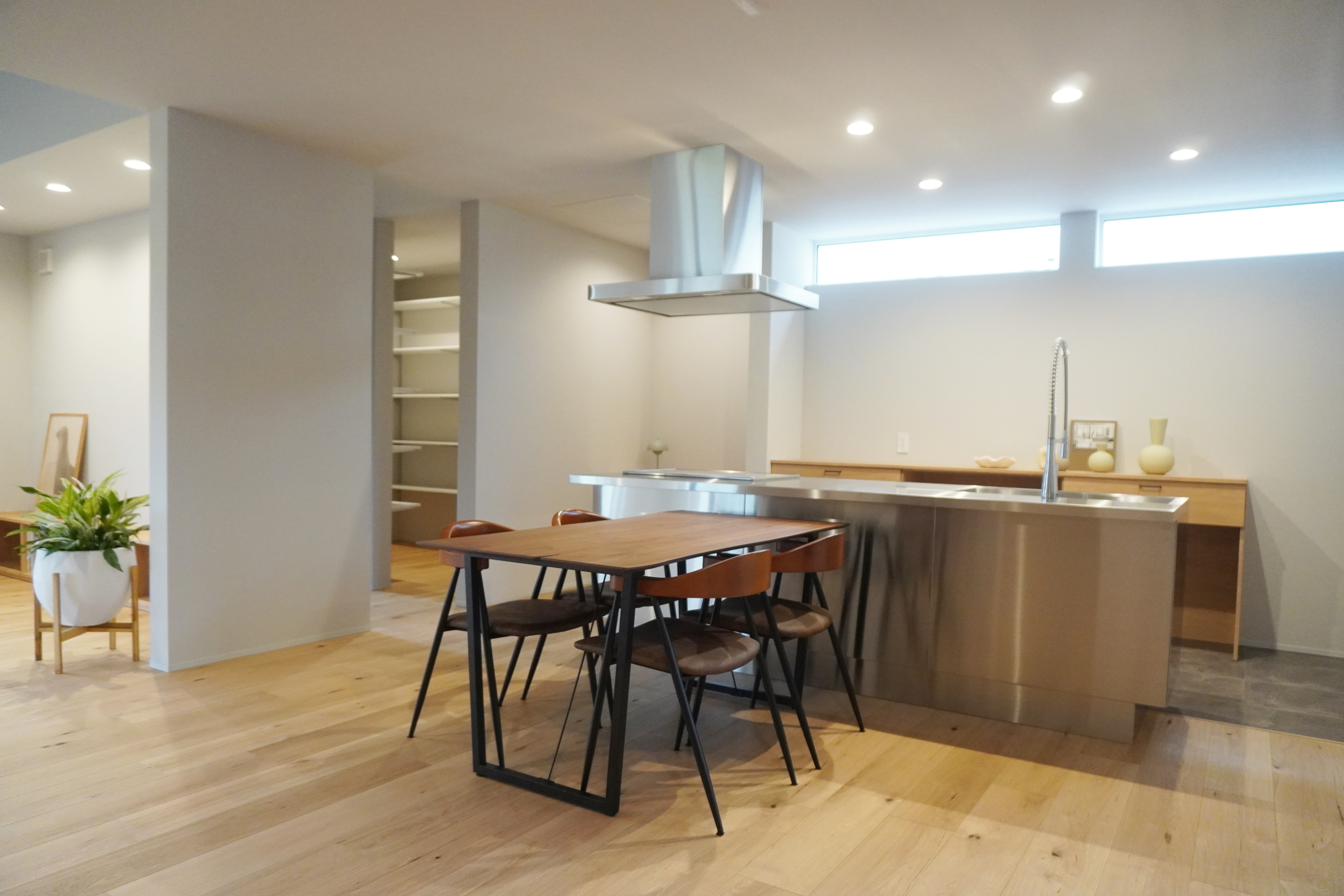 奥さまのセンスが光るグレーを基調としたインテリアはオークの無垢床やステンレスキッチンと組み合わせ、上品で洗練された空間に。